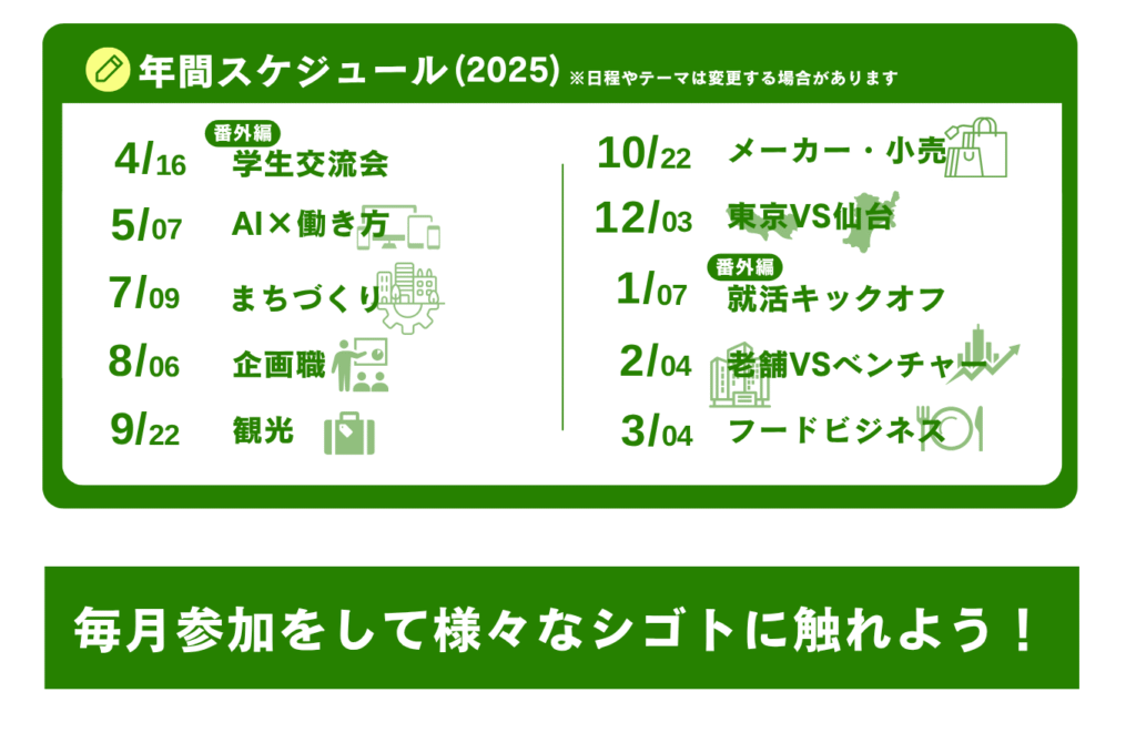 センダイシゴト大学では、毎月様々なテーマからゲストを招待し、トークイベントを開催します!将来何がやりたいかわからない…という方も、各イベントに参加し続けることで多種の様々なシゴト研究が終了できるようなイベントです!
