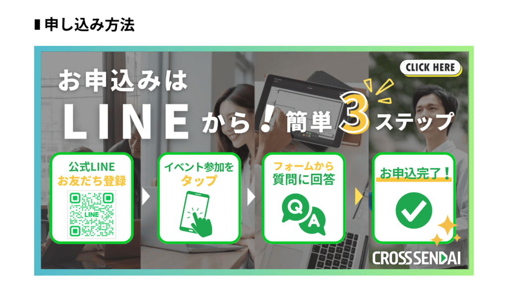 個別相談会の開始時間は、後日、運営事務局よりCROSS SENDAI公式LINEにて、個別にご案内させていただきます。