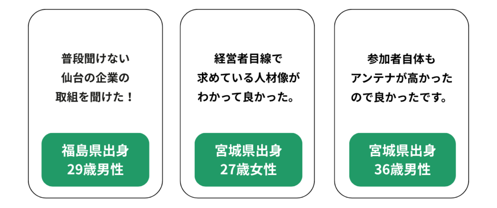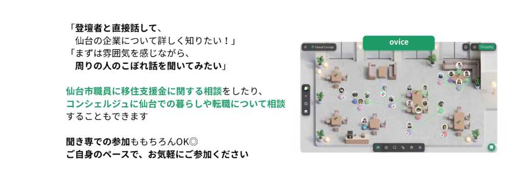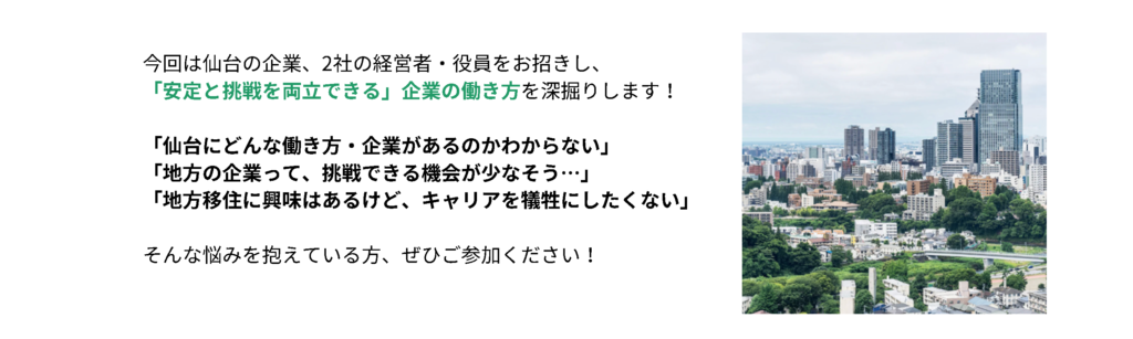 仙台の経営者・役員をゲストに招き、UIJターンにまつわる体験談や仙台の一押しの企業・転職・暮らしに関するリアルな情報を配信するオンラインイベント。