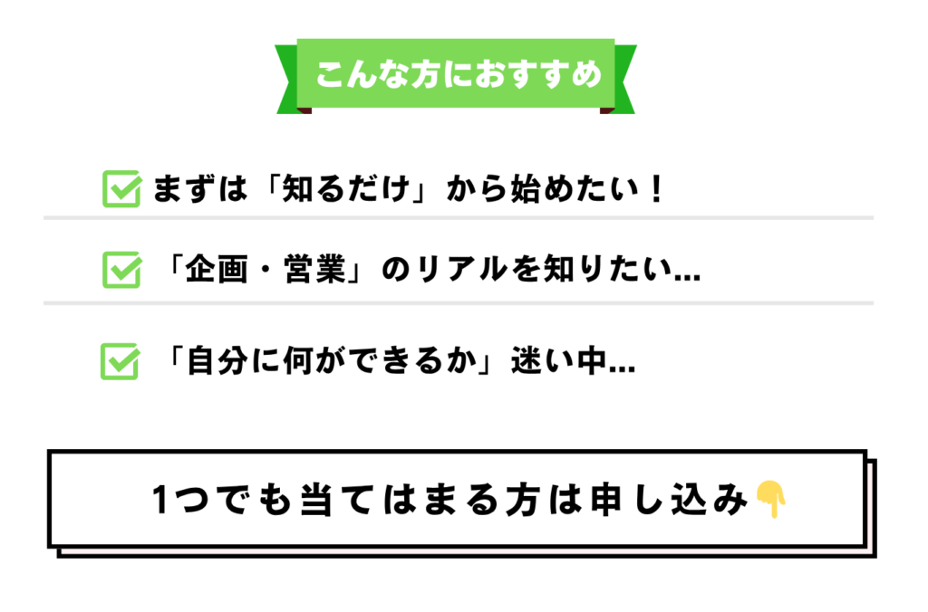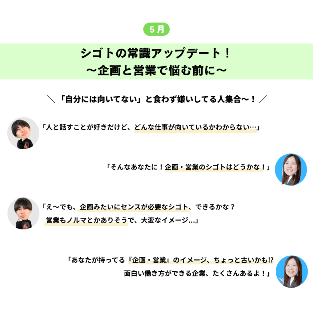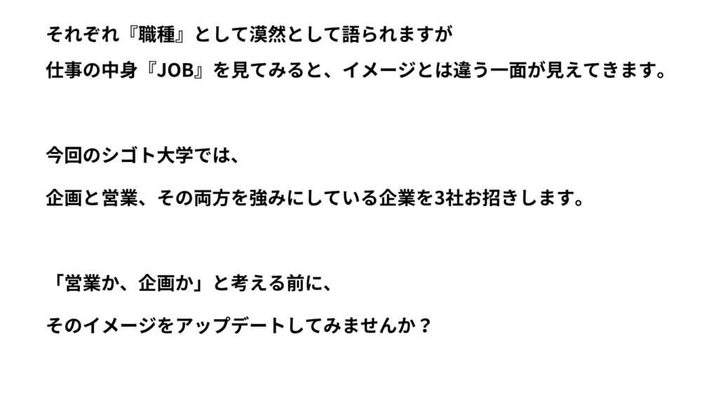 どんな商品を扱い、どんな考え方やスタンスで仕事をし、どんなお客さまや取引先と関わるのか。これらによって「やりがい」「ストレス」といったあらゆるものが、同じ業界であったとしても180度違ってくることも…。「業界・業種」ではなくその先にある「シゴト」まで目を向けることで企業と学生との相互理解が深まり、長期的に自然と良いマッチングが生まれる。そんな企画づくりを目指します!
