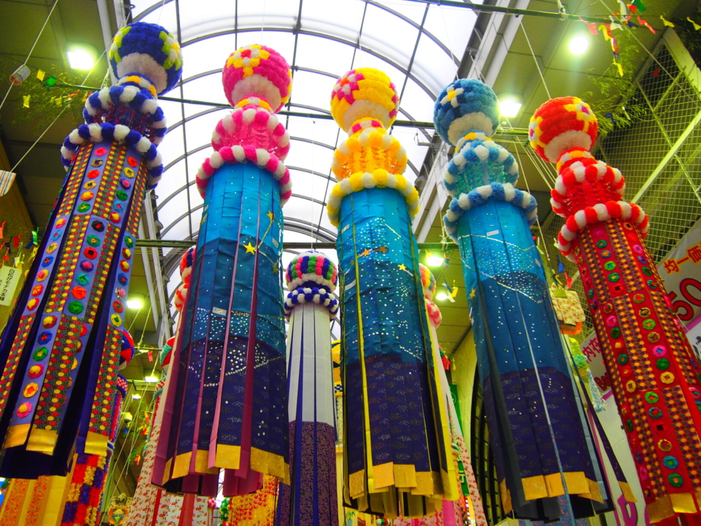 青竹に飾られた和紙と風が織りなす夏の風物詩で、東北三大祭りの一つ。吹き流しや仕掛けものなど、趣向をこらした豪華絢爛な笹飾りが市内各所を彩ります。