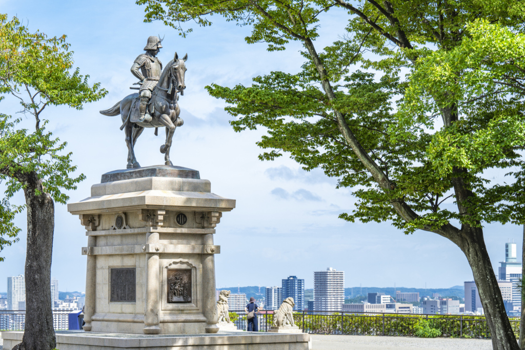伊達62万石の居城、仙台城(青葉城)が建てられた城跡には、伊達政宗公騎馬像や資料館があります。本丸跡は仙台市内が一望でき、夜にはライトアップされた騎馬像と夜景が楽しめます。また、令和18年に向けて大手門復元事業が始まっています。