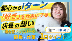 川瀬さんがアパレル職からペット業界へと転身したのは、「好きなことを長く続けたい」と考えたことがきっかけでした。憧れていた地方移住を果たし、現在は複合型ドッグパーク「Bowmu」の店長として勤めています。リラックスできる環境で大好きなワンちゃんと過ごす日々は「なりたい自分になるための答え合わせのよう」と語る川瀬さんに、お話を伺いました。