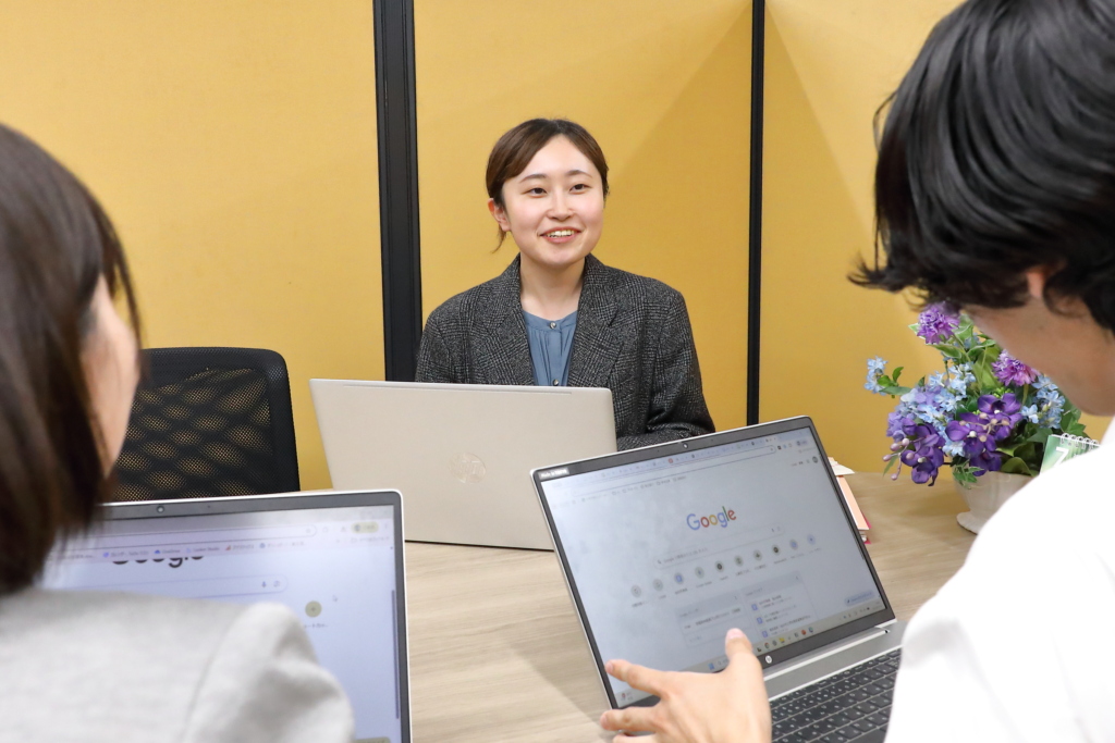 就職活動で大変だったのは、なかなか就職先が決まらず、「本当に何がしたいのか」と自問自答を繰り返したことです。しかし、人に何かを伝える仕事がしたいという軸は変わらず、その対象を限定せず、幅広い人々と関われる仕事がしたいという思いに気づきました。その結果、様々な業種や人々と関われる今の会社に巡り会うことができ、乗り越えることができました。