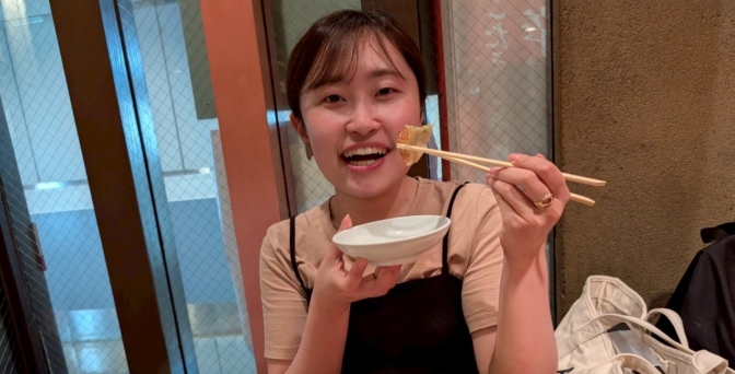 楽器屋さんに行ったり、古本屋さんに行ったりすることが多いです。戦争の話など歴史ものの本や、ポーランドも好きなのでポーランドの歴史の本などを読んだりします。こちらは私が餃子を食べている写真です。餃子が好きなので、週末はよく餃子のお店を食べ歩いています。