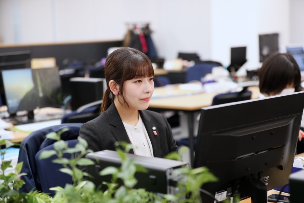 今年の1月から、人事課で採用の仕事をしています。説明会などのイベントに出席、会社説明をしたり、内定者と電話やWEB等でコミュニケーションをとったりしています。また、選考も随時行っており、ウェブ面接や対面面接の対応もしています。最近では、会社説明や一次選考も担当することがあります。